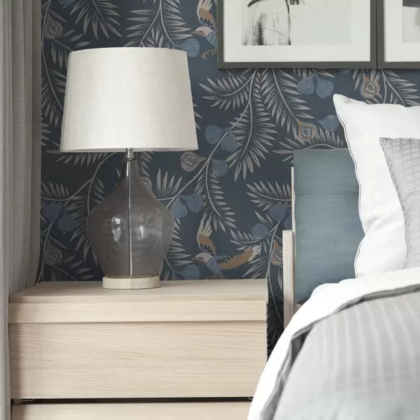 Papel pintado Pájaro entre frutos azules y hojas de palmera, índigo Nr. a00726