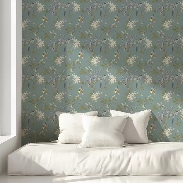 Papel pintado Pájaros, flores y mariposas sobre un fondo azul grisáceo Nr. a00735