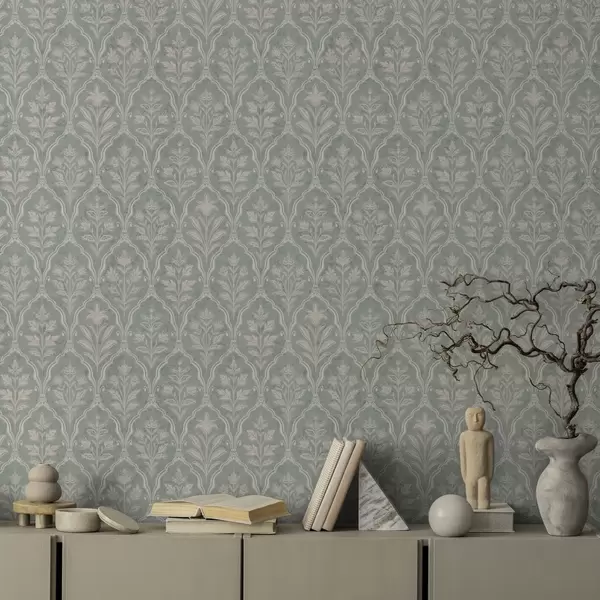 Papel pintado Damasco menta con finos medallones florales Nr. a00741