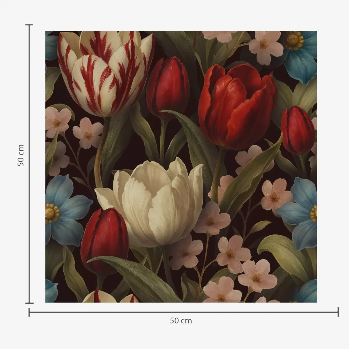 Papel pintado Tulipanes brillantes y flores azules sobre fondo oscuro Nr. a00746