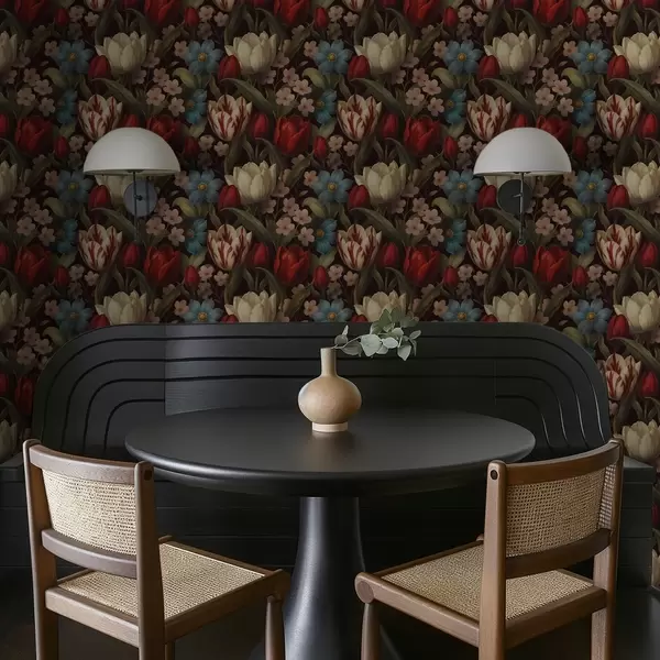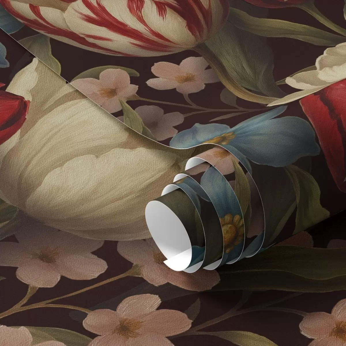 Papel pintado Tulipanes brillantes y flores azules sobre fondo oscuro Nr. a00746
