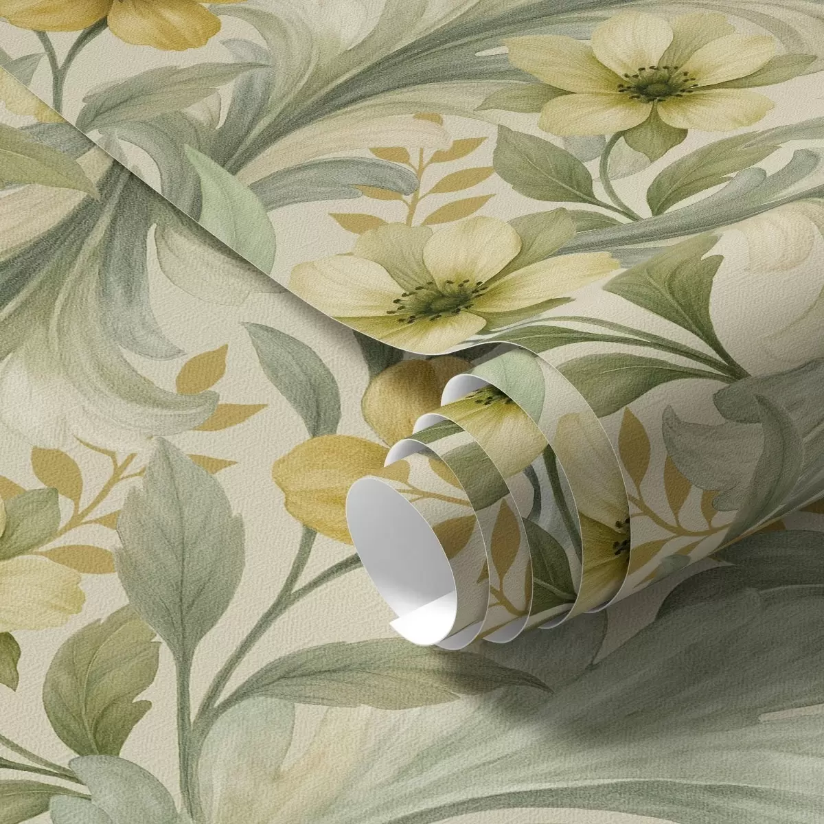 Papel pintado Volutas de acanto con flores en tonos verdes y amarillos Nr. a00749