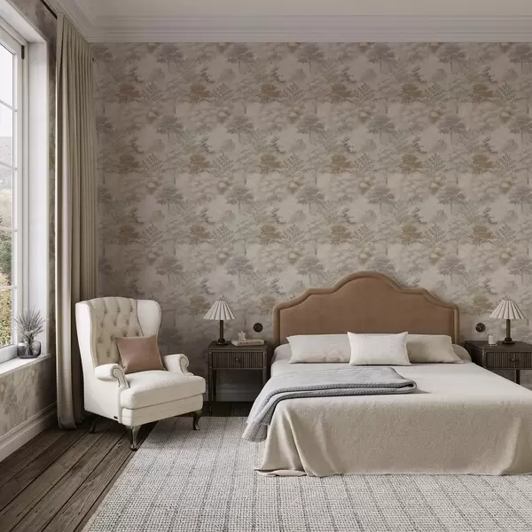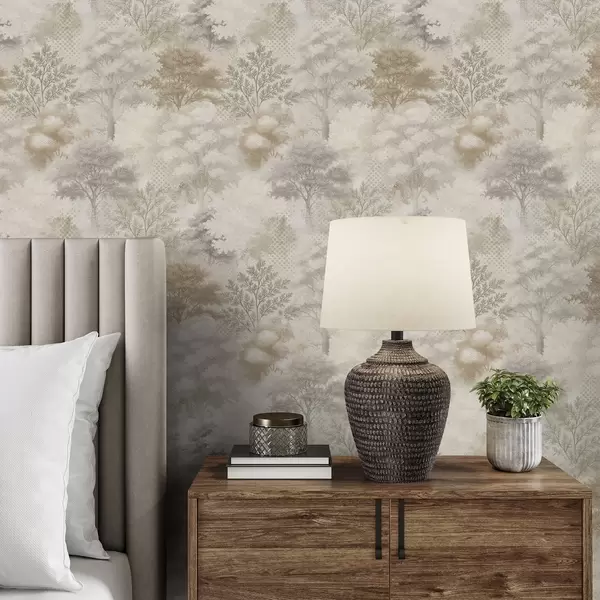 Papel pintado Bosque apacible envuelto en niebla, suaves tonos beige y grisáceos. Nr. a00785