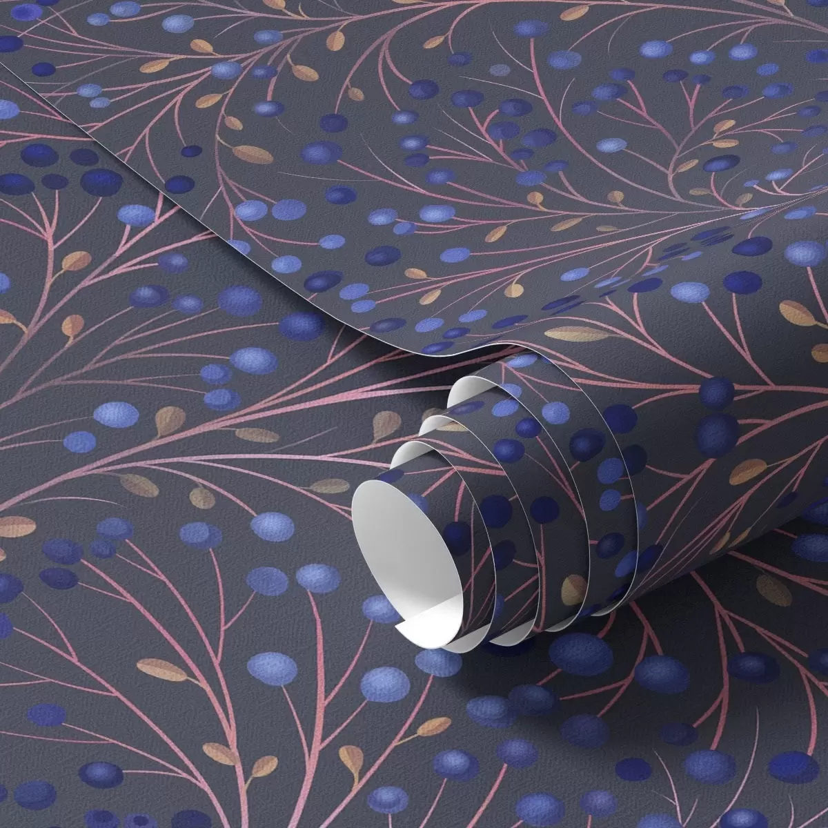 Papel pintado Ramitas de color rosa-marrón y bayas azules sobre fondo grafito a00787