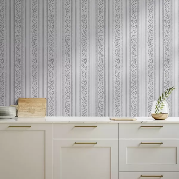 Papel pintado Rayas con encaje y ramitas en blanco frío Nr. a00814v1
