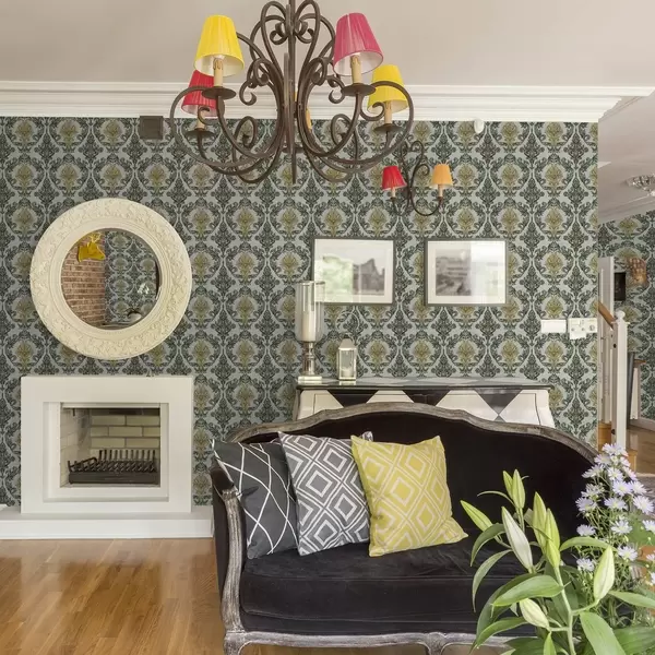 Papel pintado Damasco con volutas verdes sobre fondo claro. Nr. a00828v1