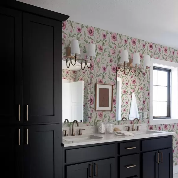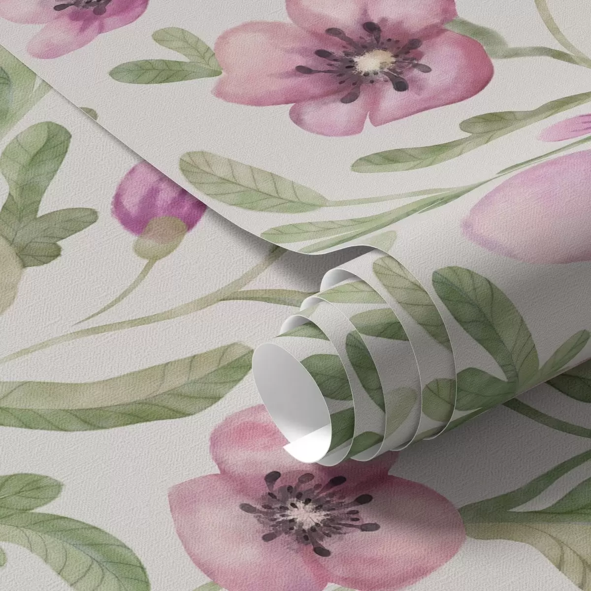 Papel pintado Delicadas amapolas rosas con hojas en técnica acuarela a00830