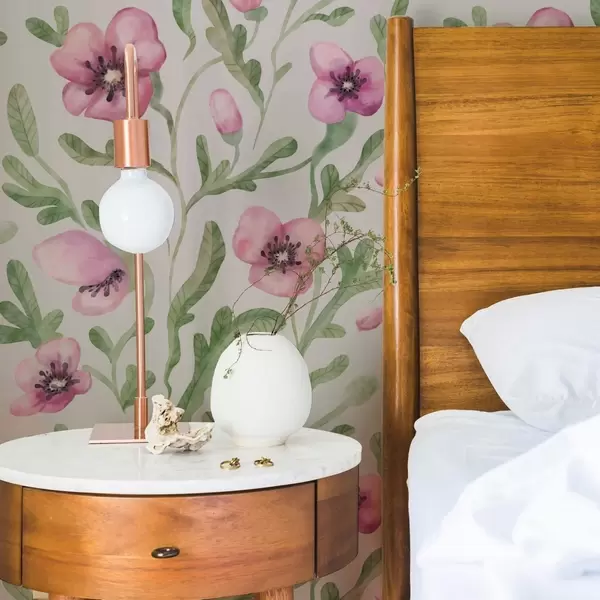 Papel pintado Delicadas amapolas rosas con hojas en técnica acuarela Nr. a00830