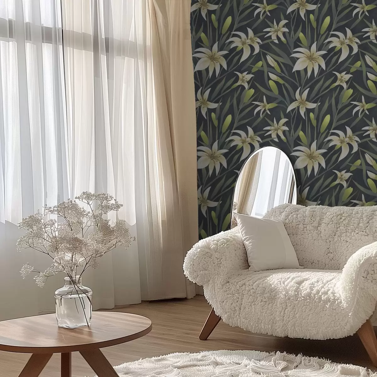 Papel pintado Lirios crema con hojas sobre fondo oscuro Nr. a00837v1