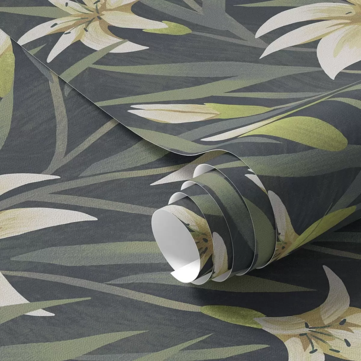 Papel pintado Lirios crema con hojas sobre fondo oscuro Nr. a00837v1