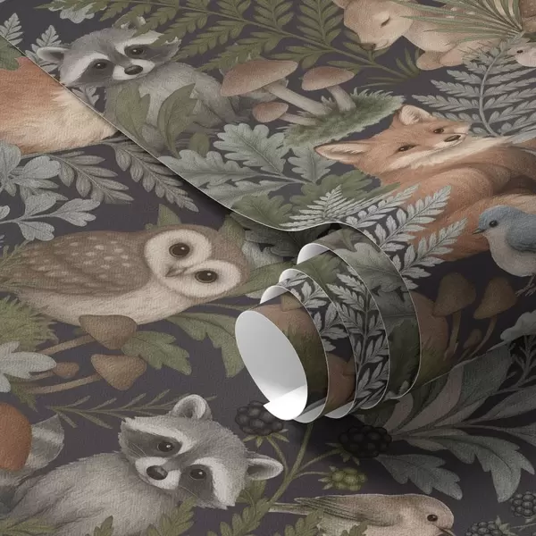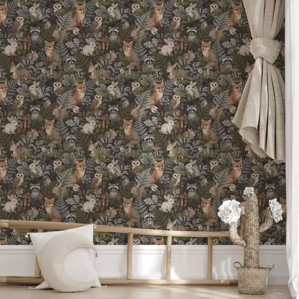 Papel pintado Animales del bosque y helechos sobre carbón oscuro Nr. a00880