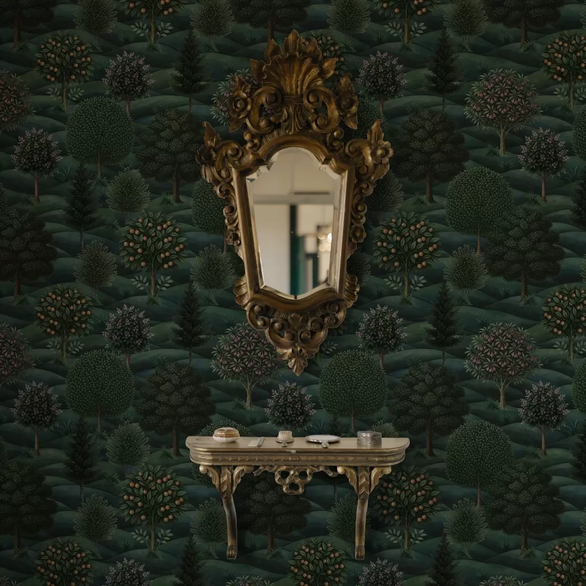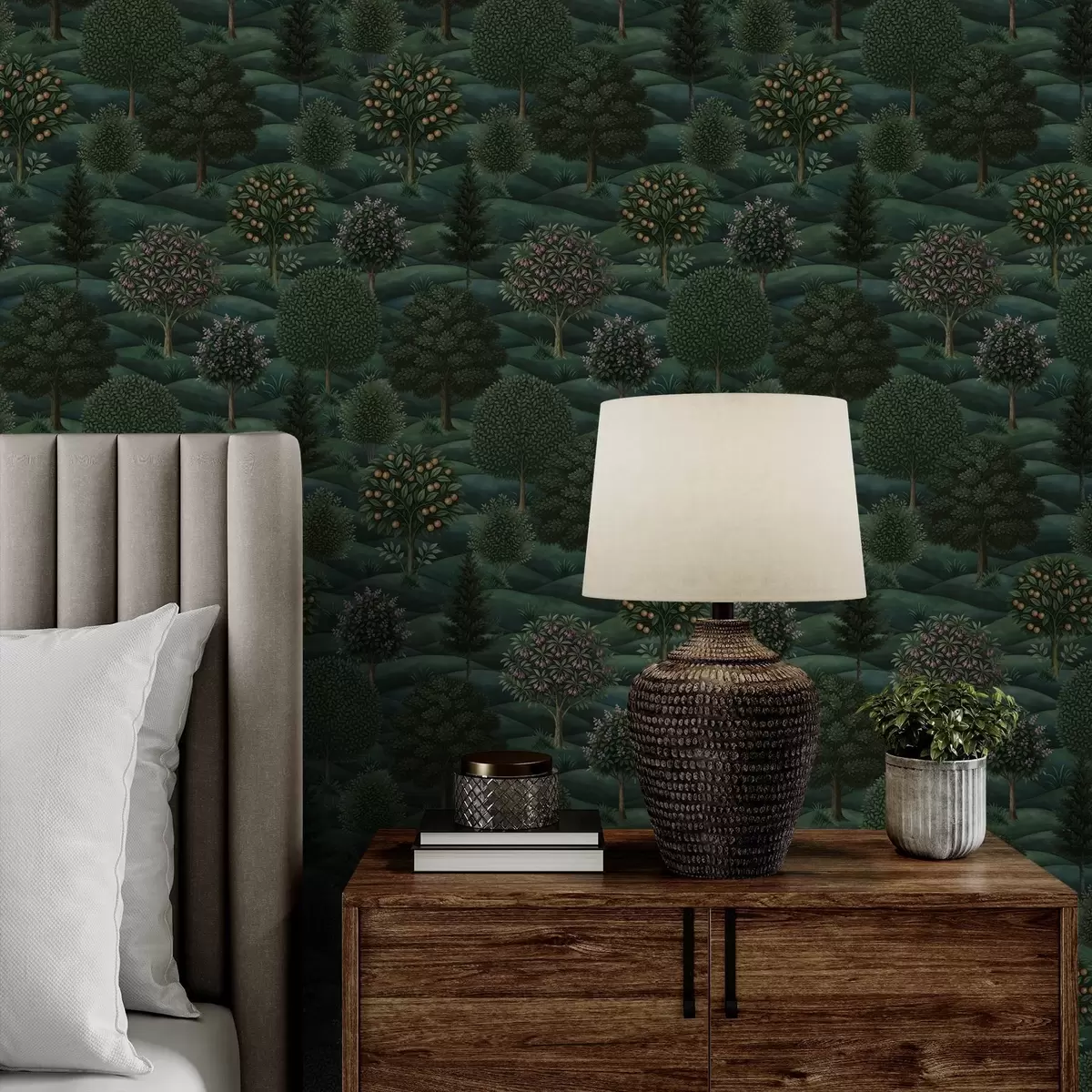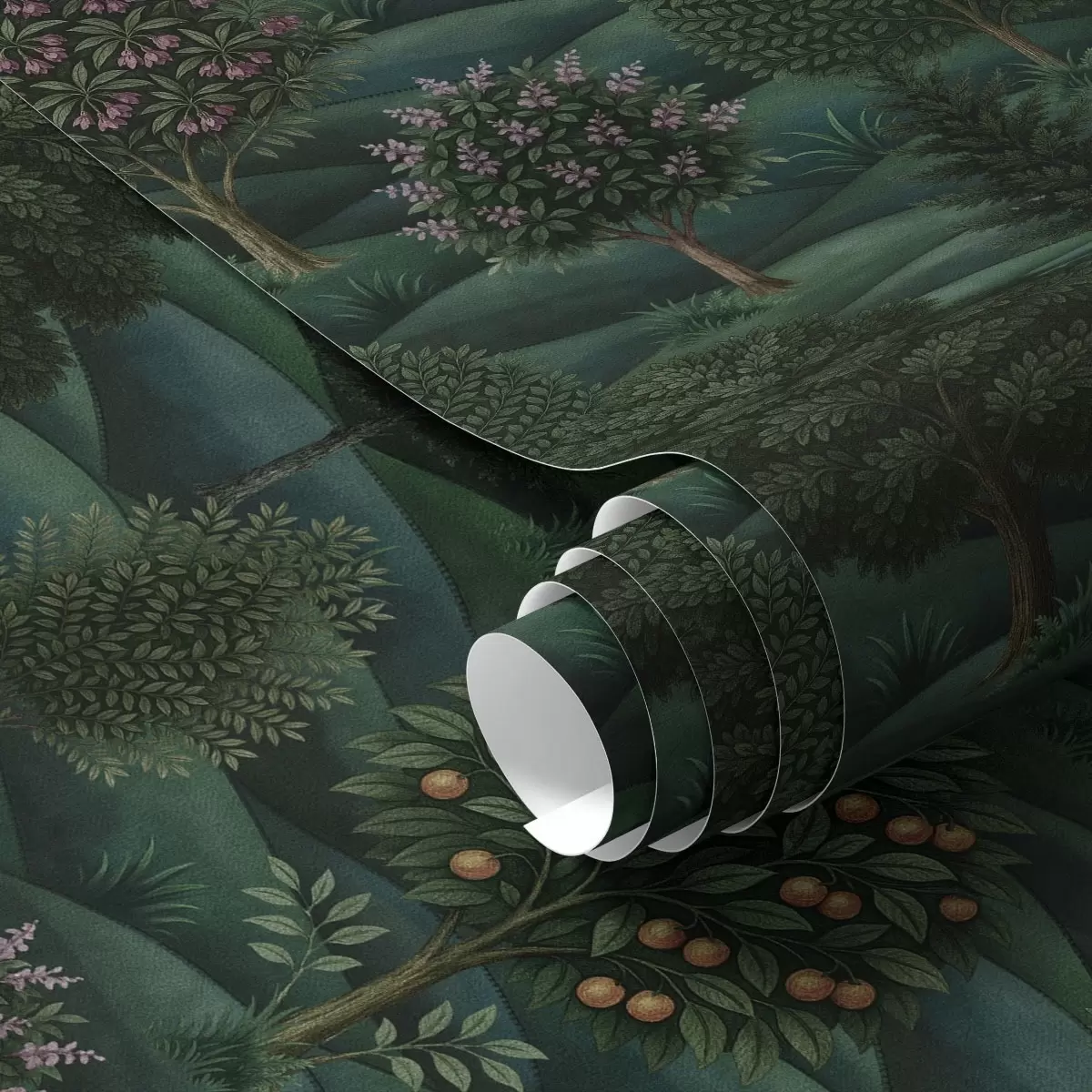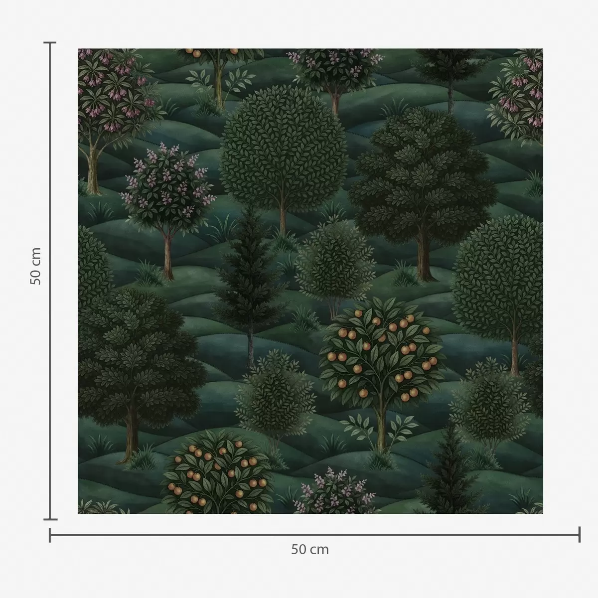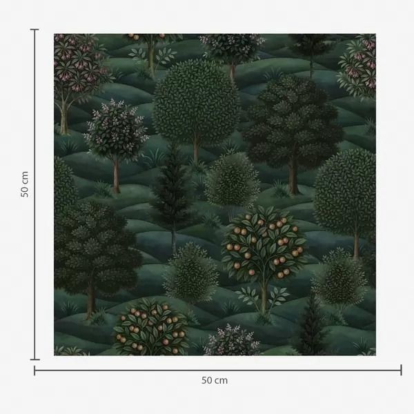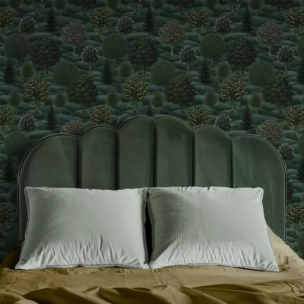 Papel pintado Paisaje ondulado de un verde intenso con árboles dispuestos en patrones. Nr. a00892