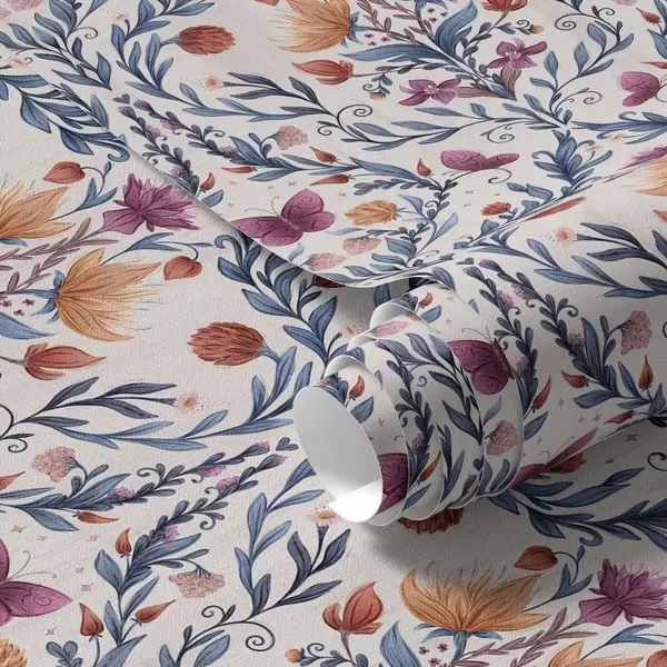 Papel pintado Damasco floral con mariposas en azul marino y terracota sobre fondo blanco. Nr. a00926v1