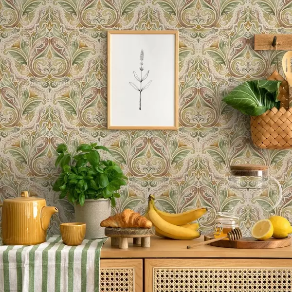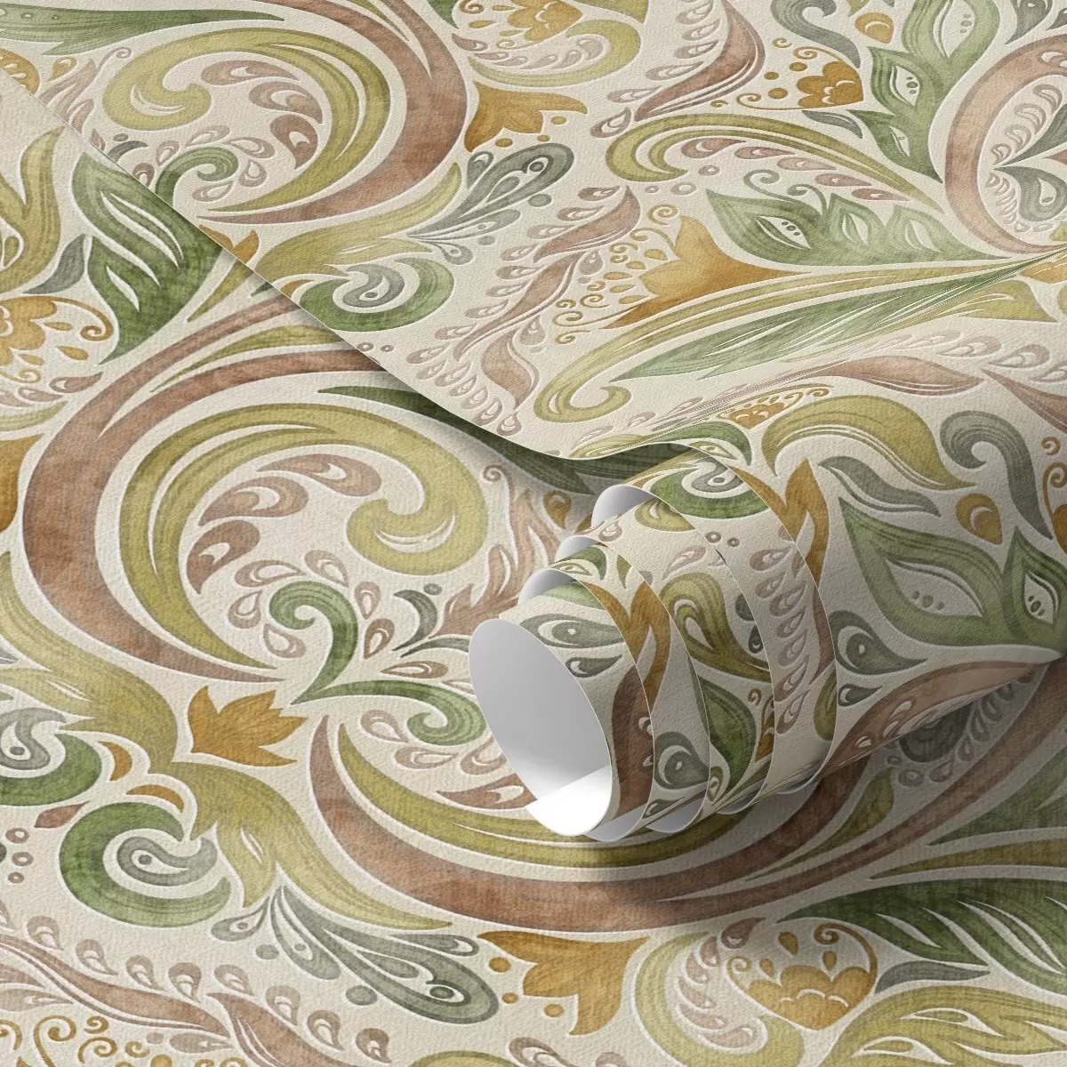 Papel pintado Remolinos de hojas en acuarela en tonos verdes y ocres cálidos. Nr. a00927