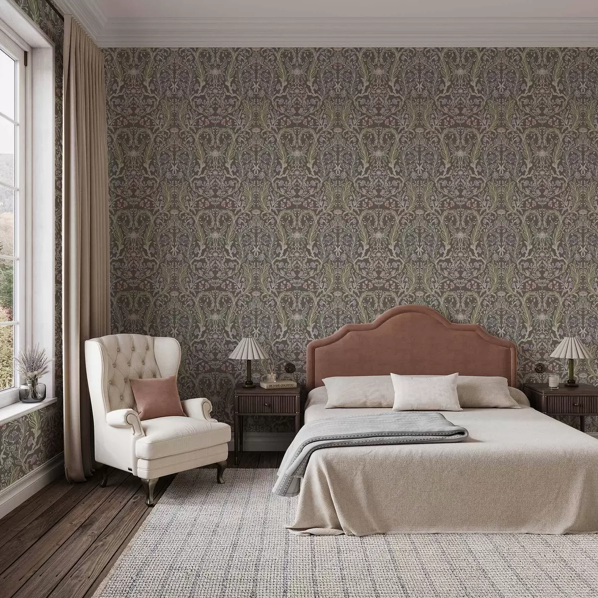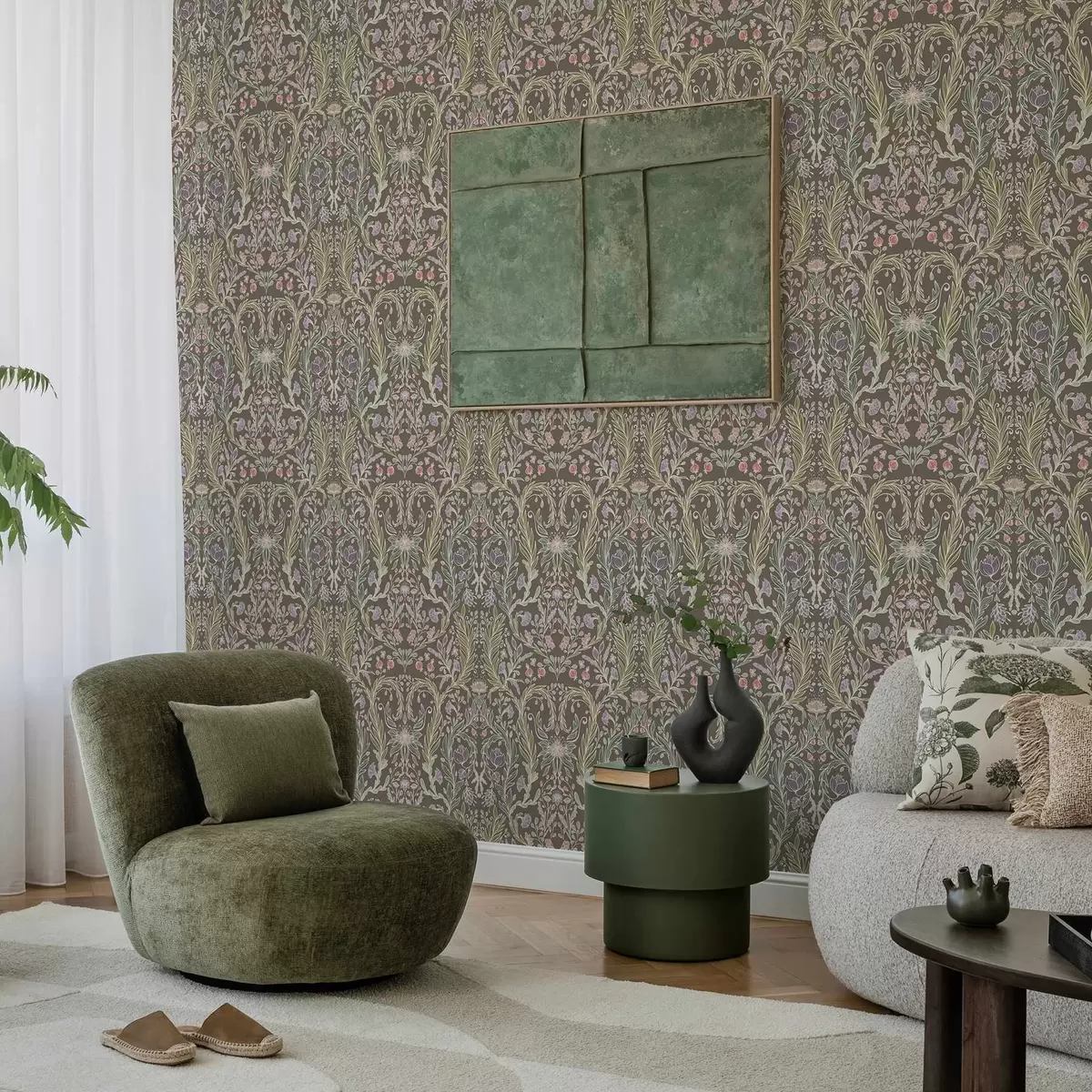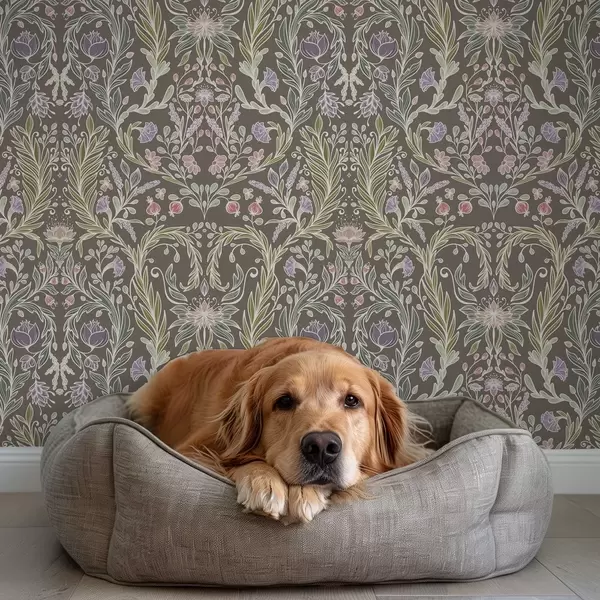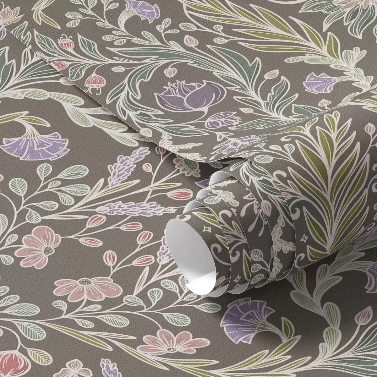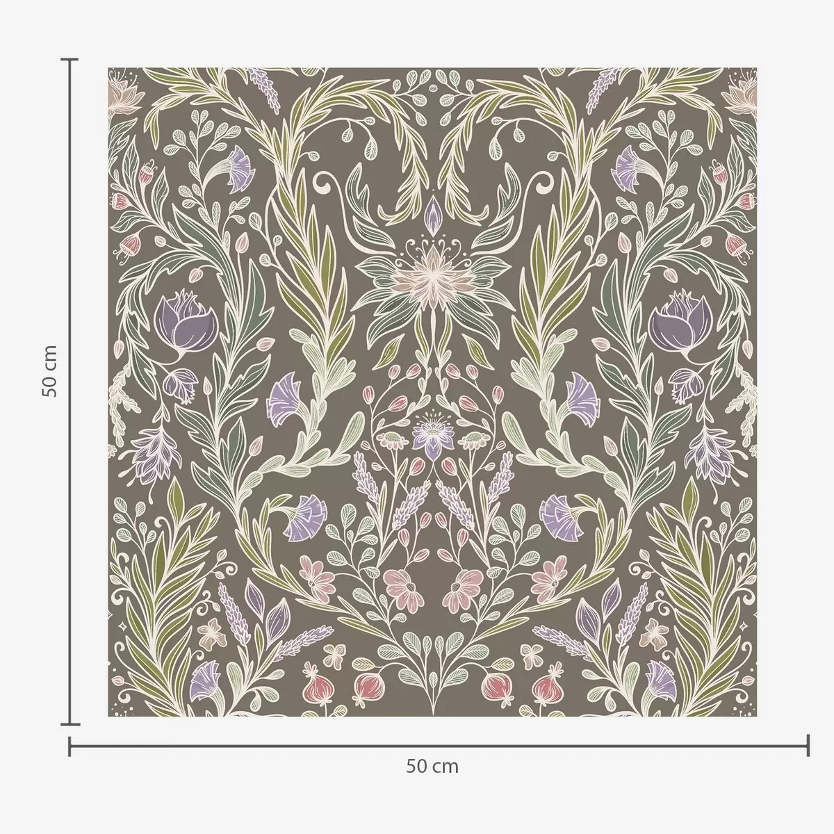 Papel pintado Flores y hojas simétricas sobre un fondo gris marrón. Nr. a00928v2