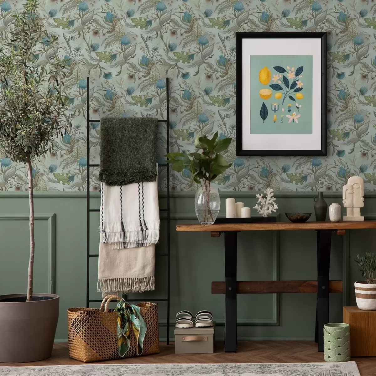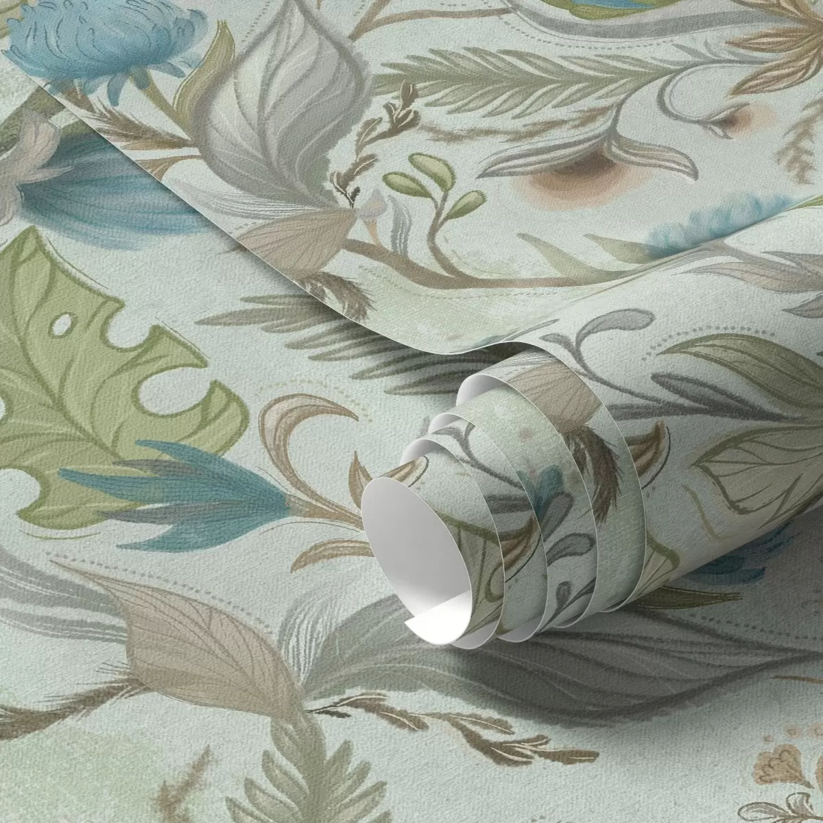 Papel pintado Flores azules y vegetación sobre un suave fondo menta. Nr. a00930v1