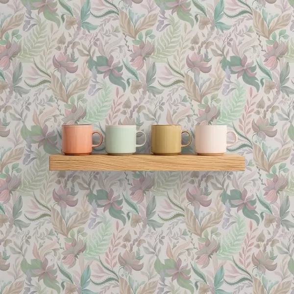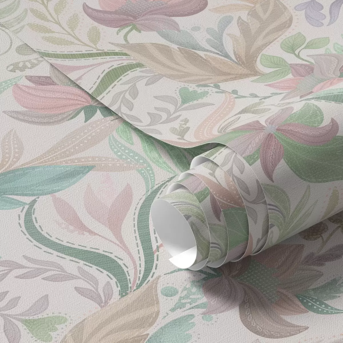 Papel pintado Delicadas flores y hojas en tonos pastel sobre un fondo claro. Nr. a00931