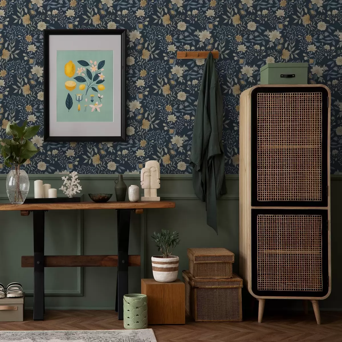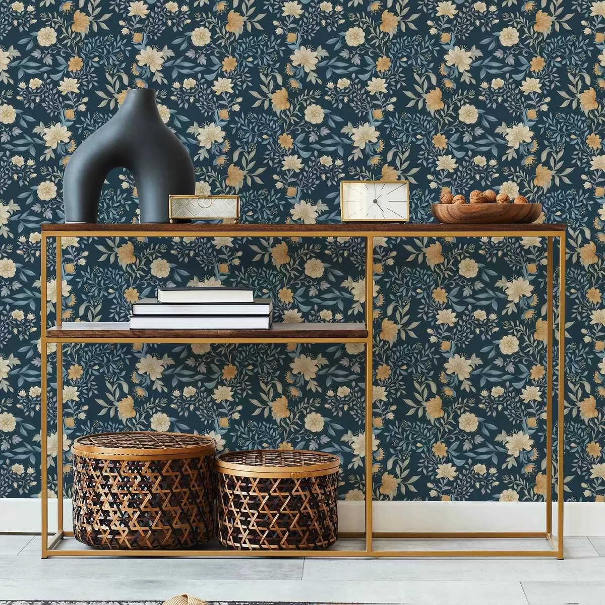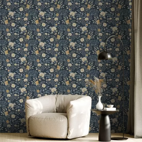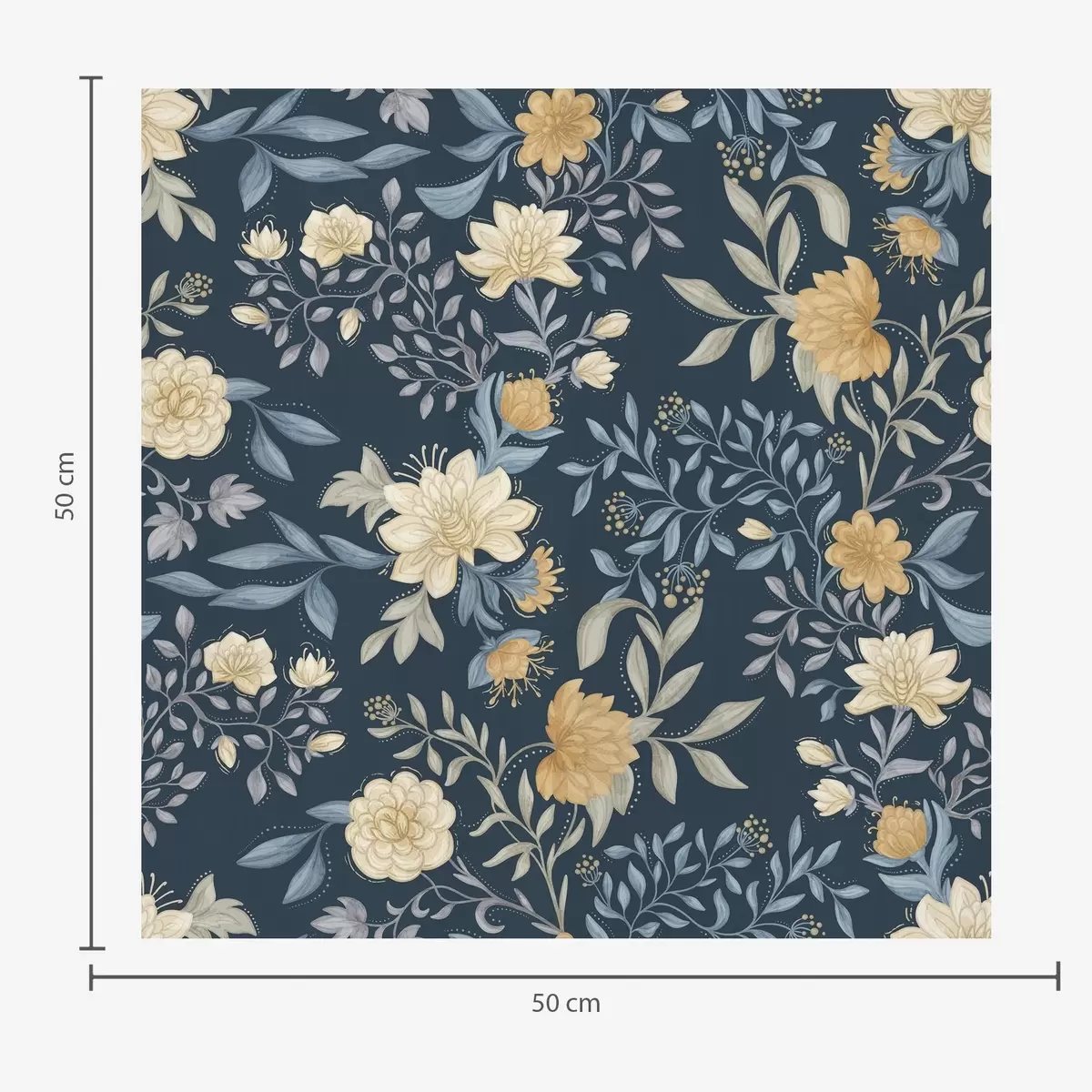 Papel pintado Flores amarillas y azules sobre un fondo azul oscuro vespertino. Nr. a00934v1