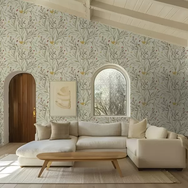 Papel pintado Flores amarillas y rojas sobre un fondo verde claro Nr. a00937