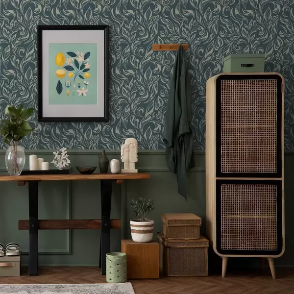 Papel pintado Patrón de hojas con líneas claras sobre fondo azul grisáceo. Nr. a00940