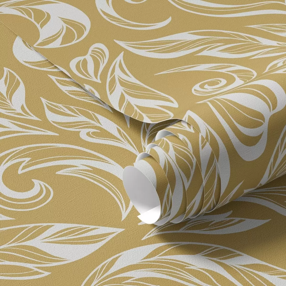 Papel pintado Adorno foliado de color blanco crema sobre un fondo ocre cálido. Nr. a00940v1