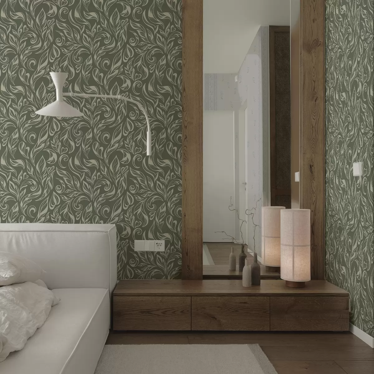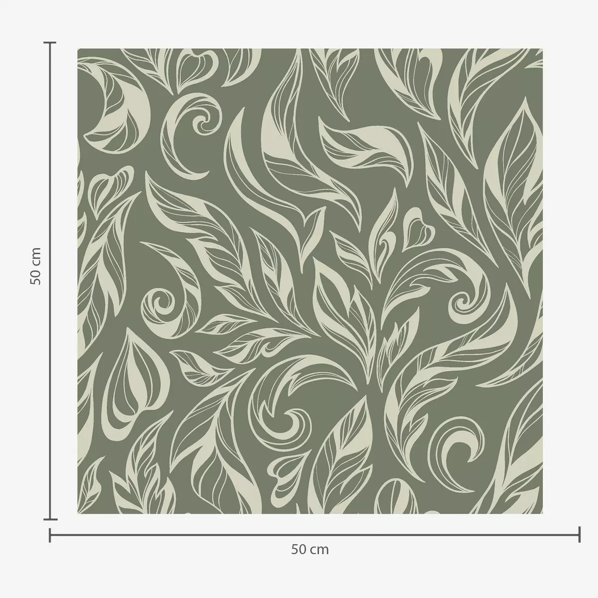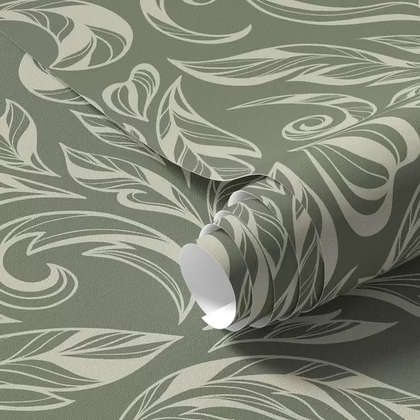 Papel pintado Adorno de hojas color crema sobre fondo gris verdoso. Nr. a00940v2