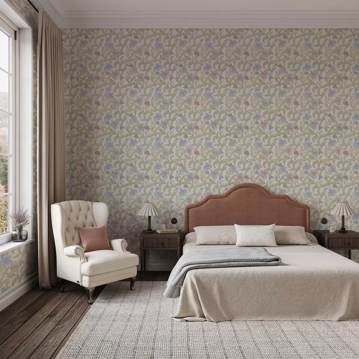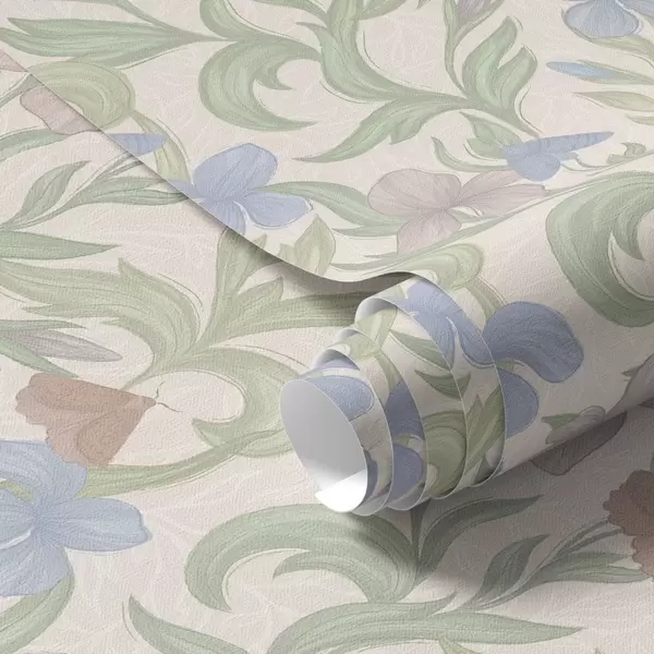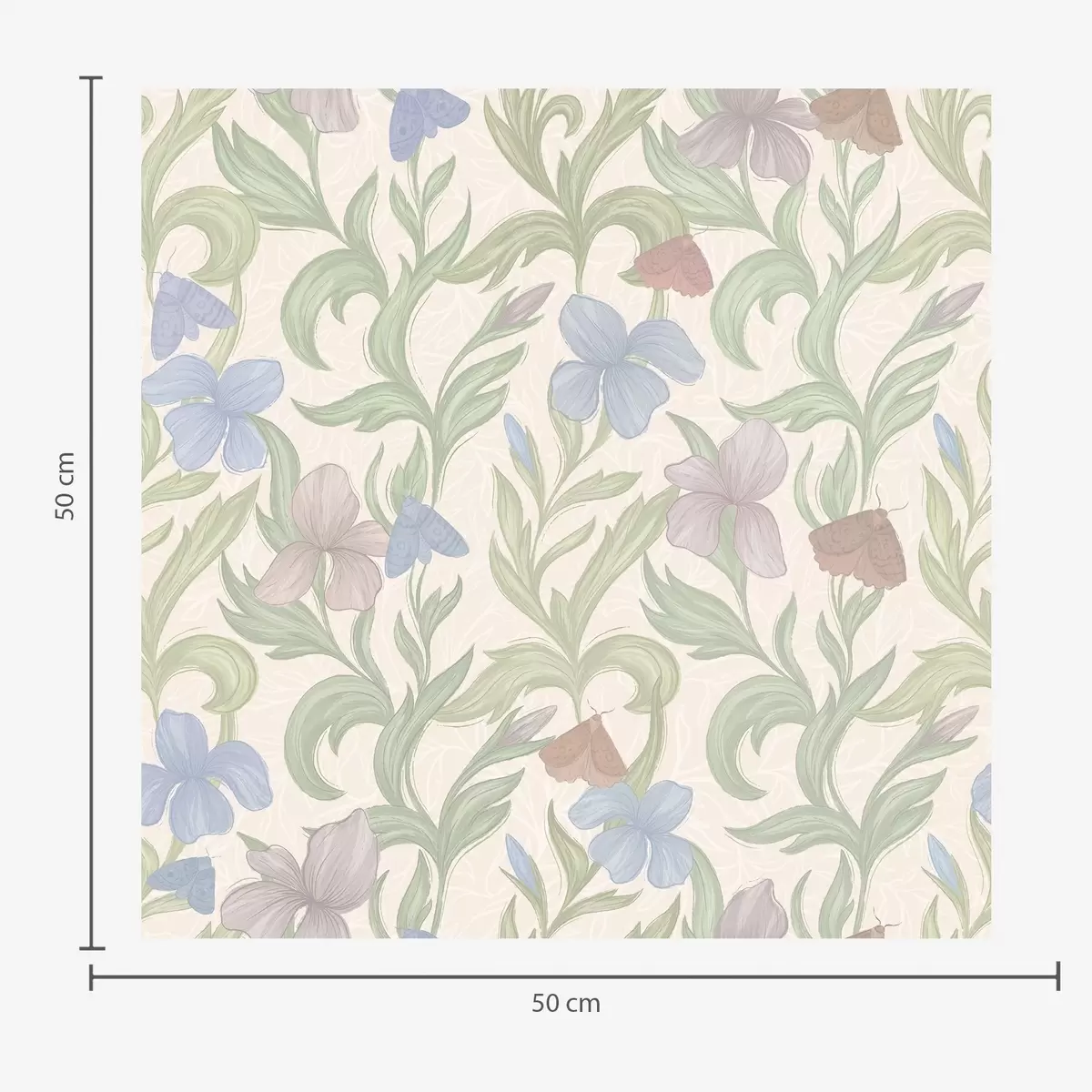 Papel pintado Flores y mariposas en tonos pastel sobre fondo crema. Nr. a00944