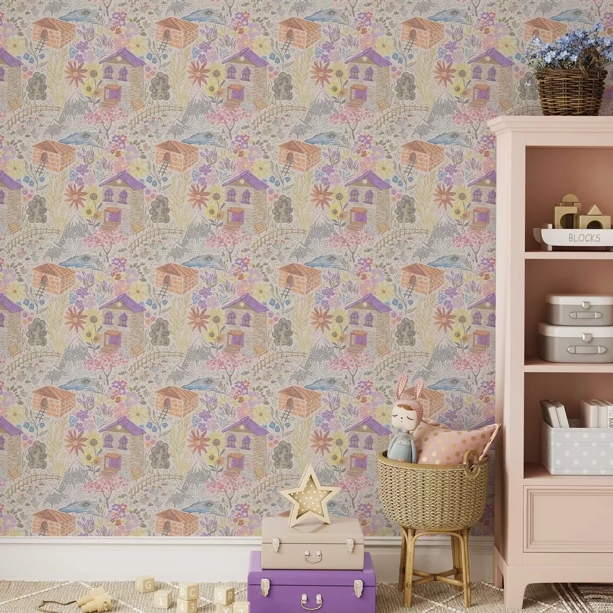 Papel pintado Dibujo infantil de un pueblo con una casa, montañas y flores. Nr. a00952