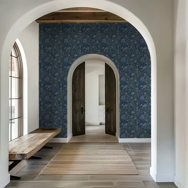 Papel pintado Bayas azul medianoche y flores blancas en un follaje denso Nr. a00994