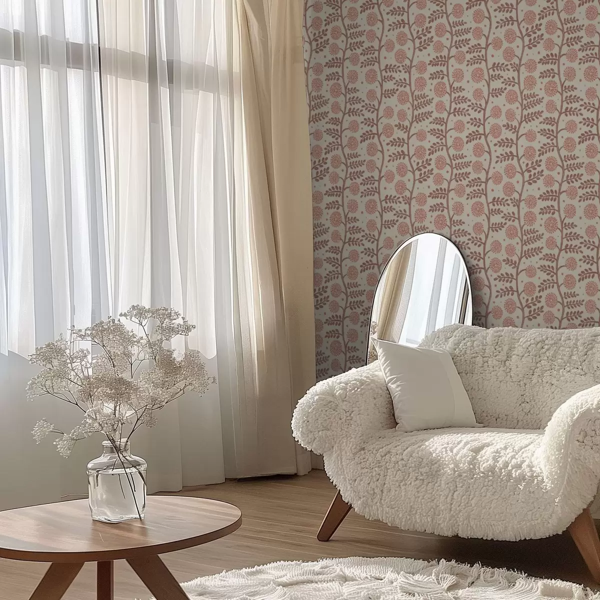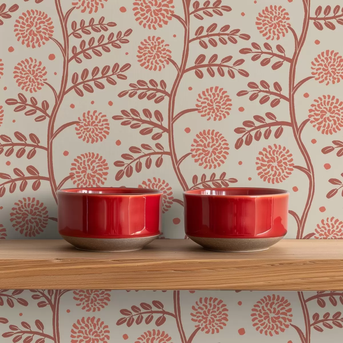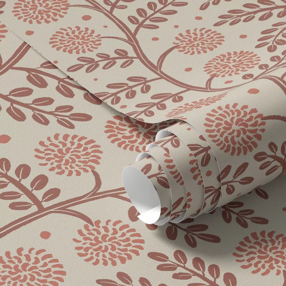 Papel pintado Tallos de terracota con flores coralinas y esponjosas sobre fondo crema. Nr. a00997v1