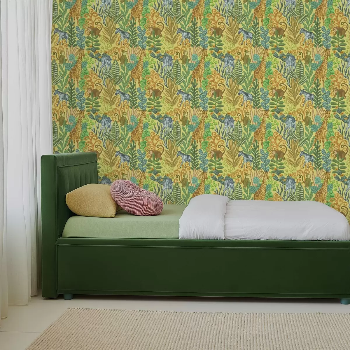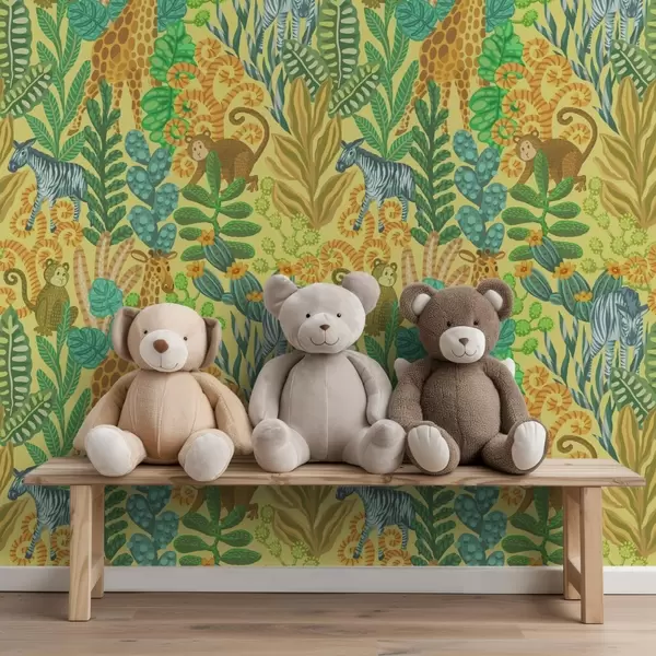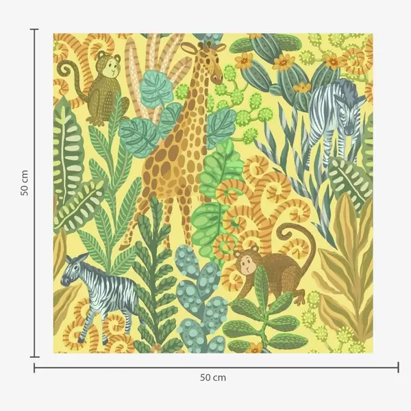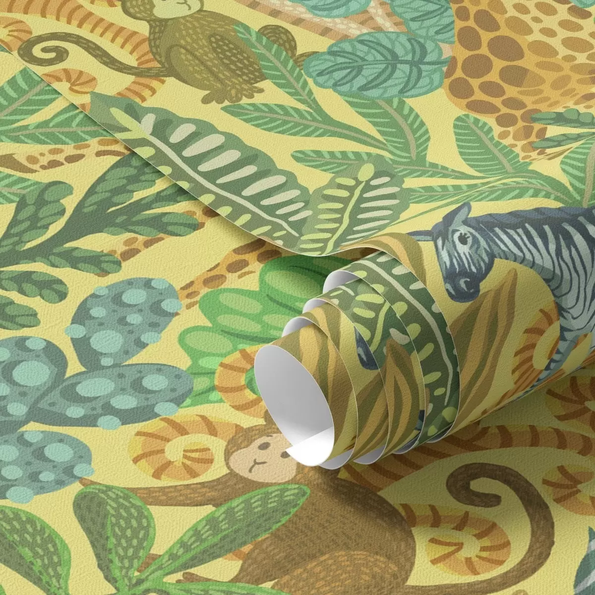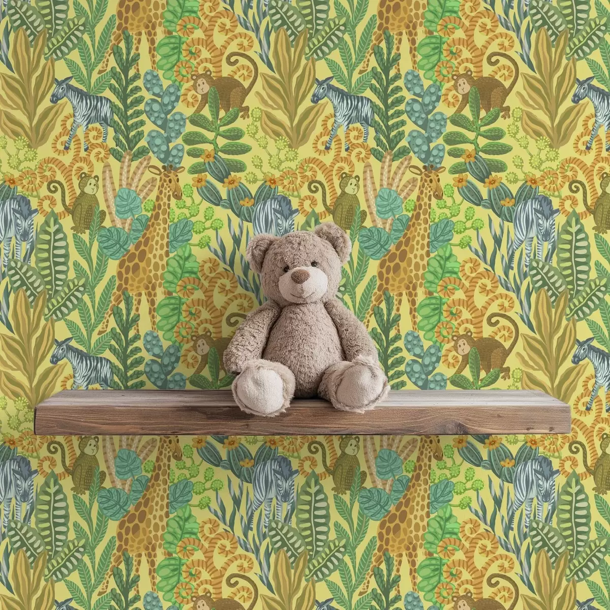 Papel pintado Jirafa, cebra y mono en una sabana de color amarillo brillante. Nr. a01000v1