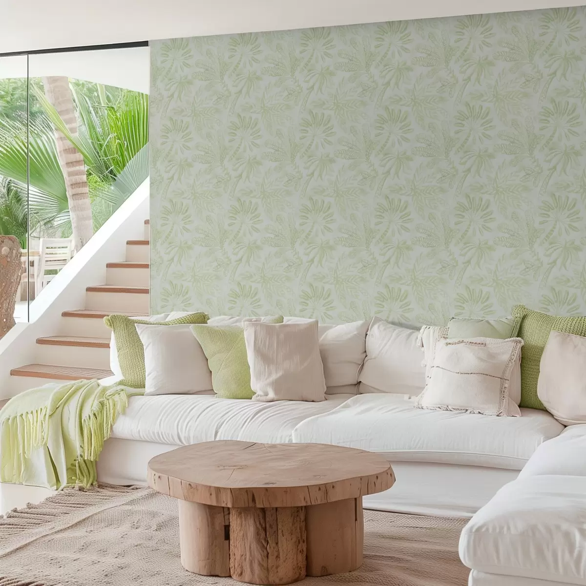 Papel pintado Hojas tropicales esbozadas en tonos verde claro frescos. Nr. a01001v1