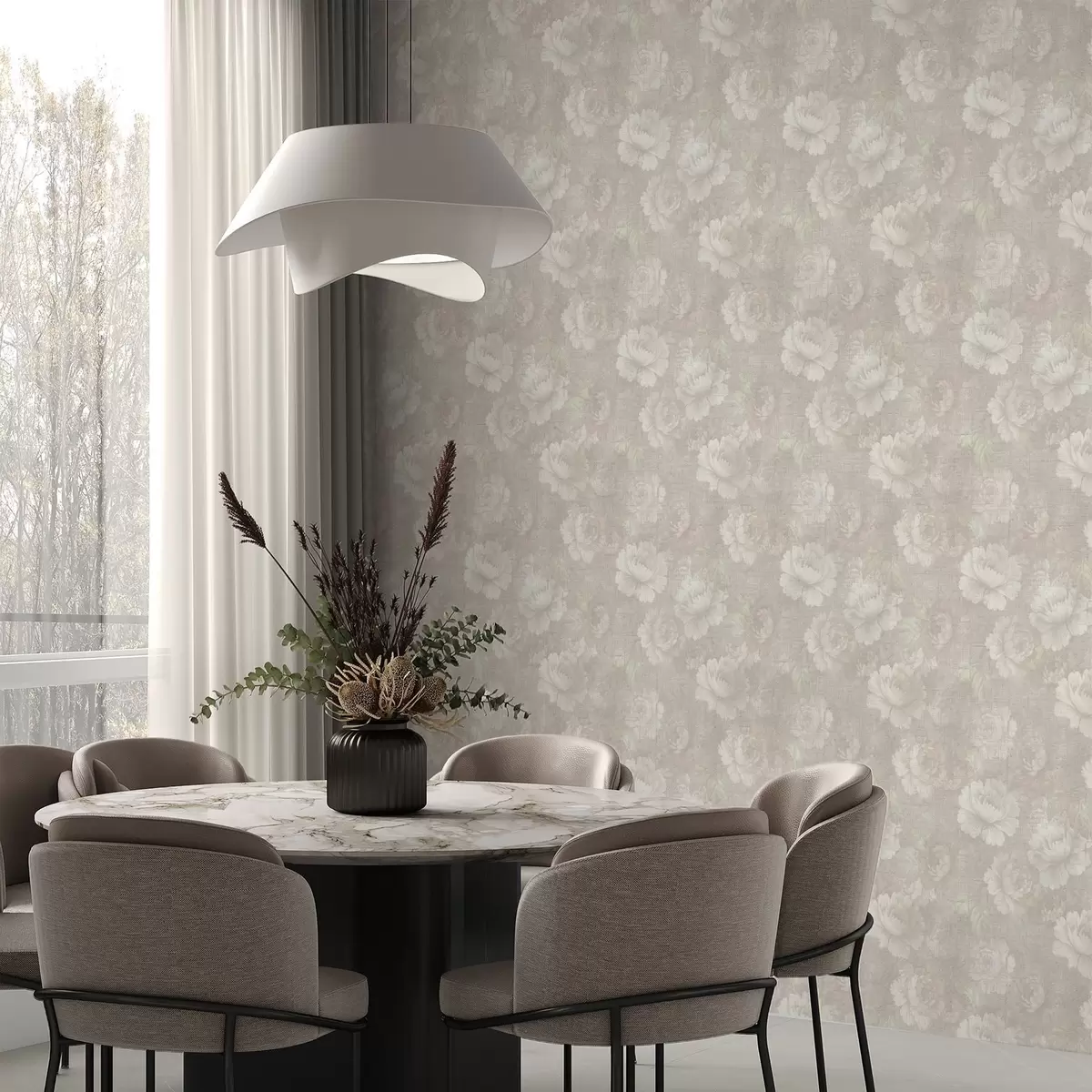 Papel pintado Peonías descoloridas sobre textura de lino en una suave paleta de colores beige Nr. a01018
