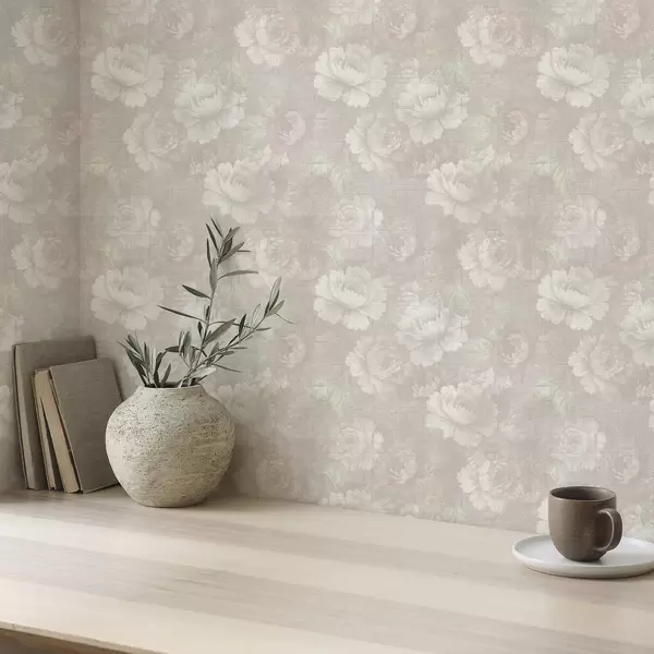 Papel pintado Peonías descoloridas sobre textura de lino en una suave paleta de colores beige Nr. a01018