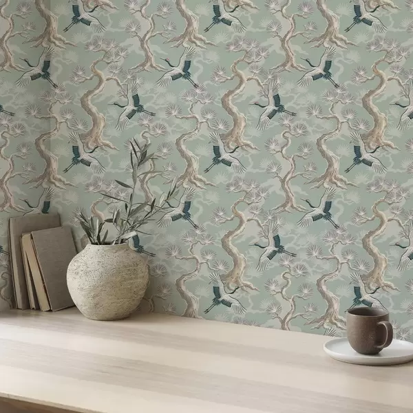 Papel pintado Grullas entre ramas curvadas sobre un suave fondo color salvia Nr. a01023