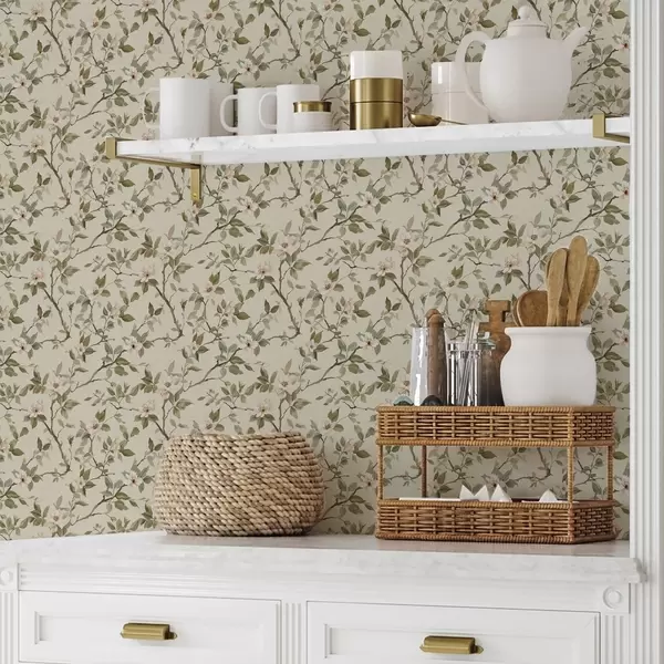 Papel pintado Ramas ligeras con pequeñas flores color crema y hojas verdes Nr. a01028