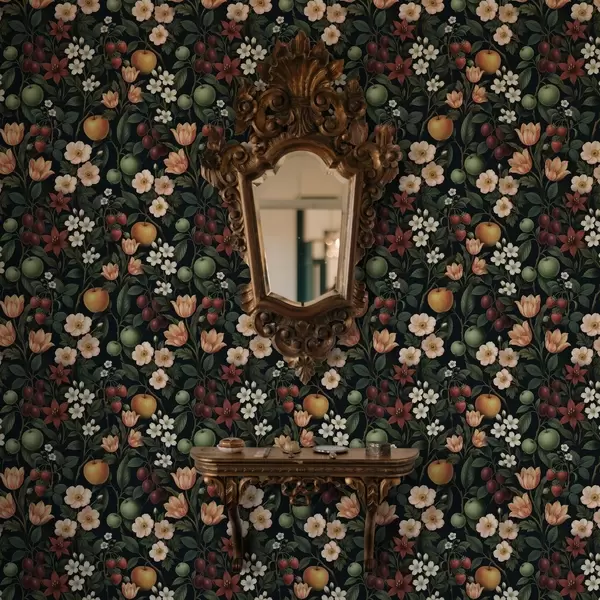 Papel pintado Jardín oscuro con flores, manzanas maduras y bayas Nr. a01034