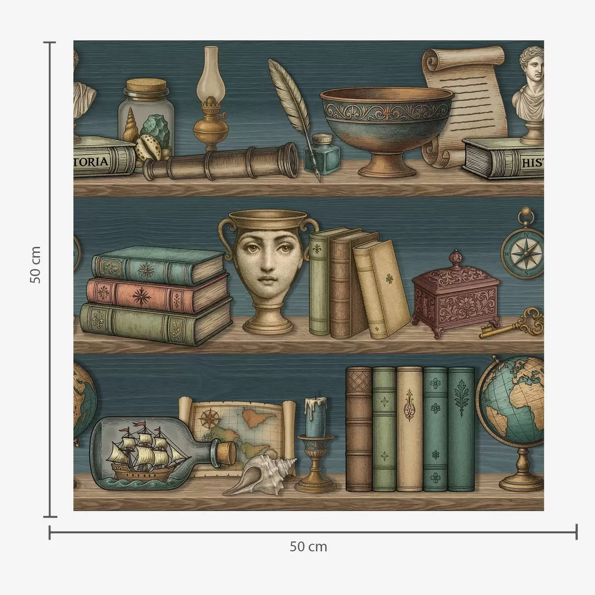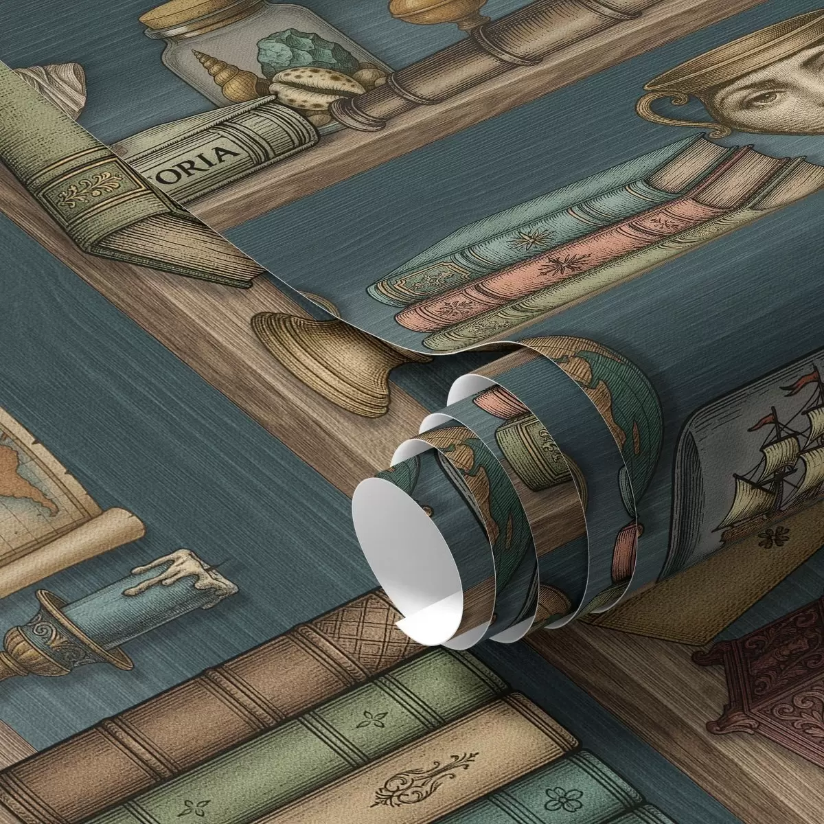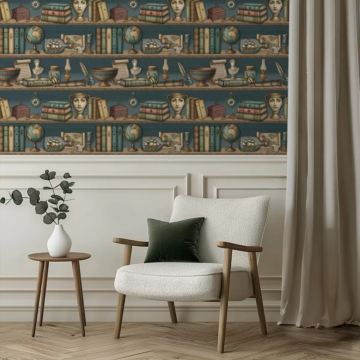 Papel pintado Estanterías vintage con libros, un globo terráqueo y curiosidades marinas. Nr. a01036