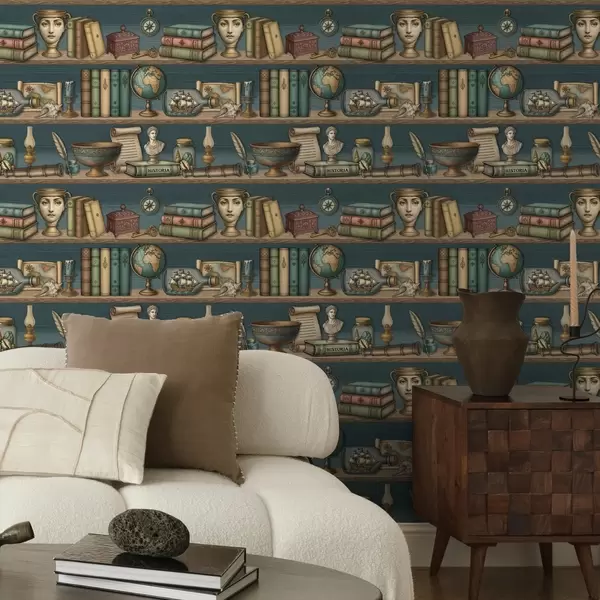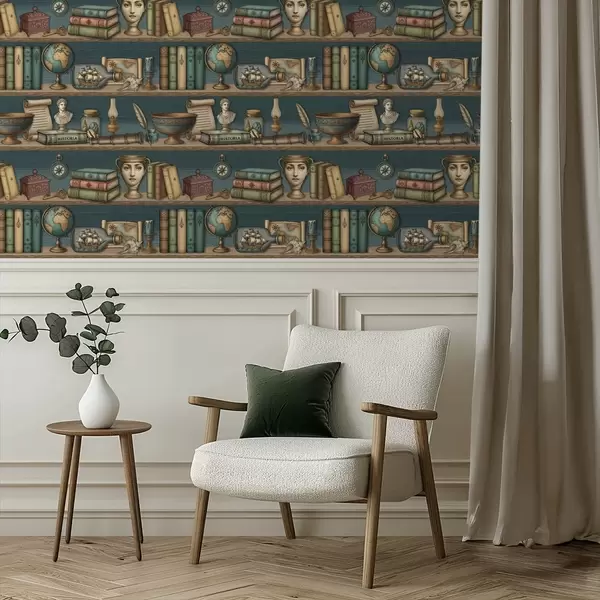 Papel pintado Estanterías vintage con libros, un globo terráqueo y curiosidades marinas Nr. a01036