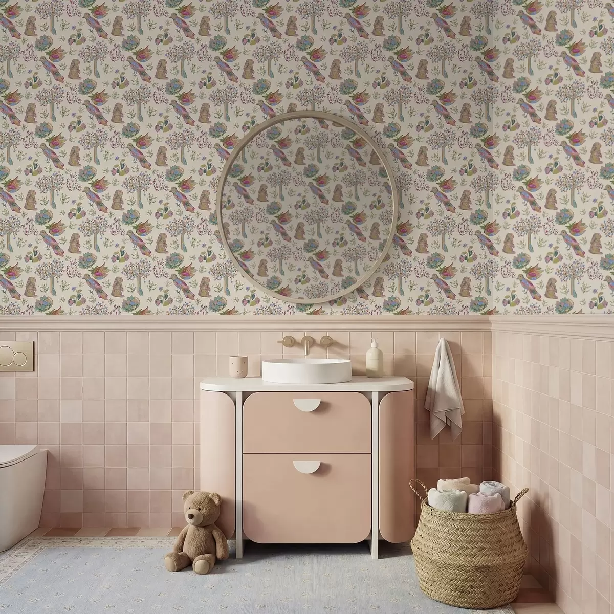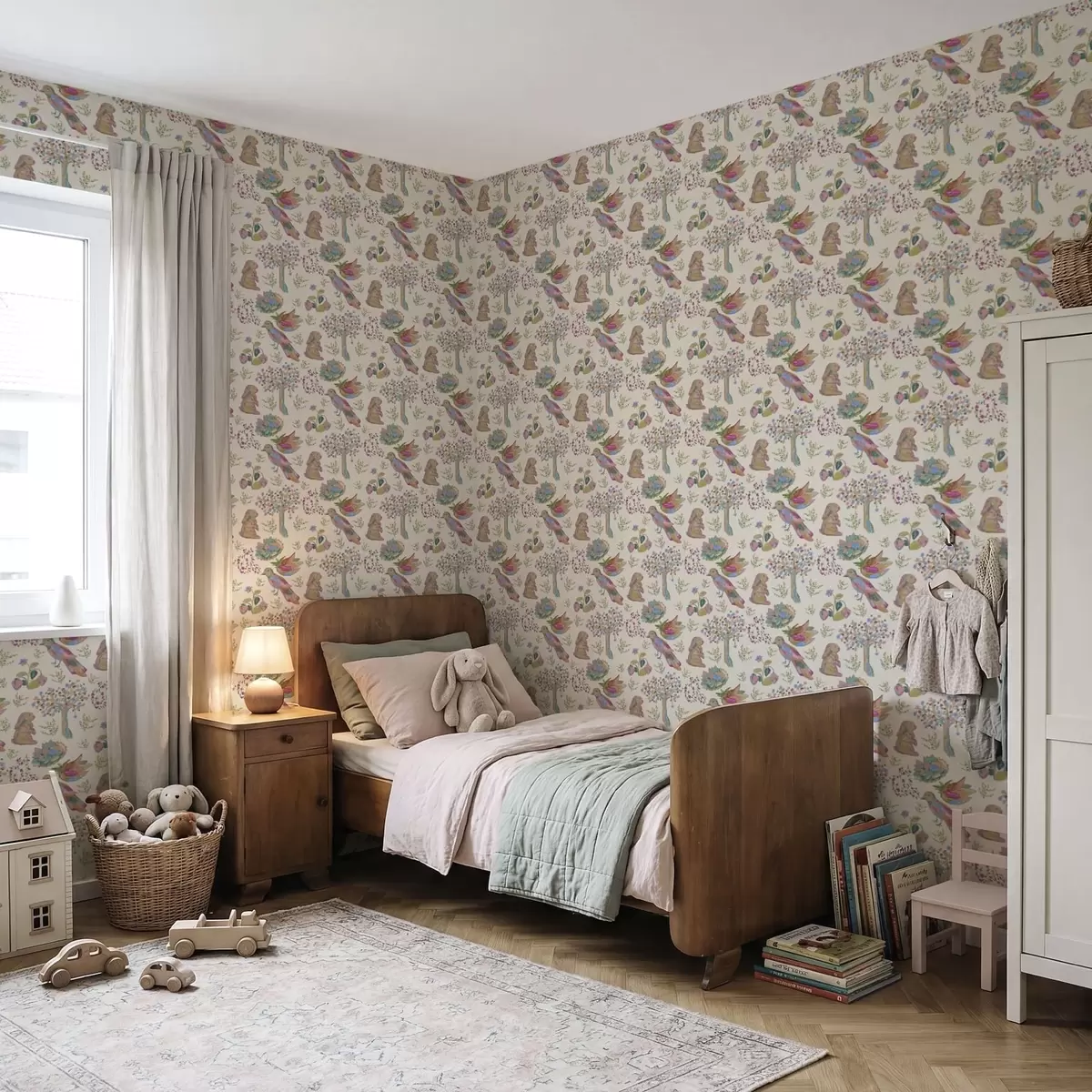 Papel pintado Colorido estampado infantil con pájaros y conejos. Nr. a01127