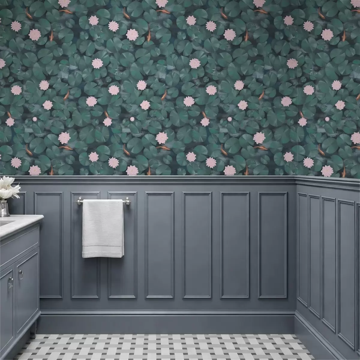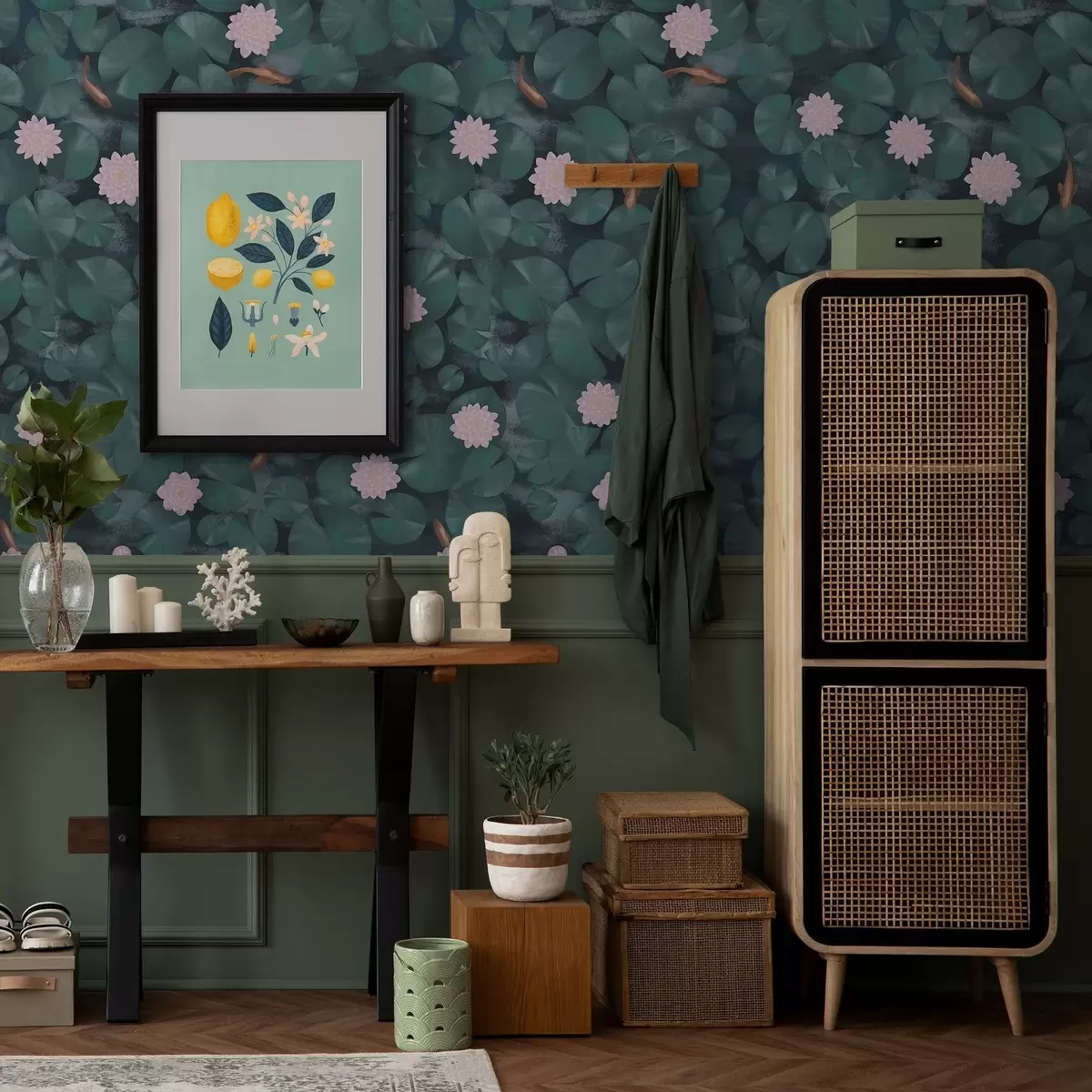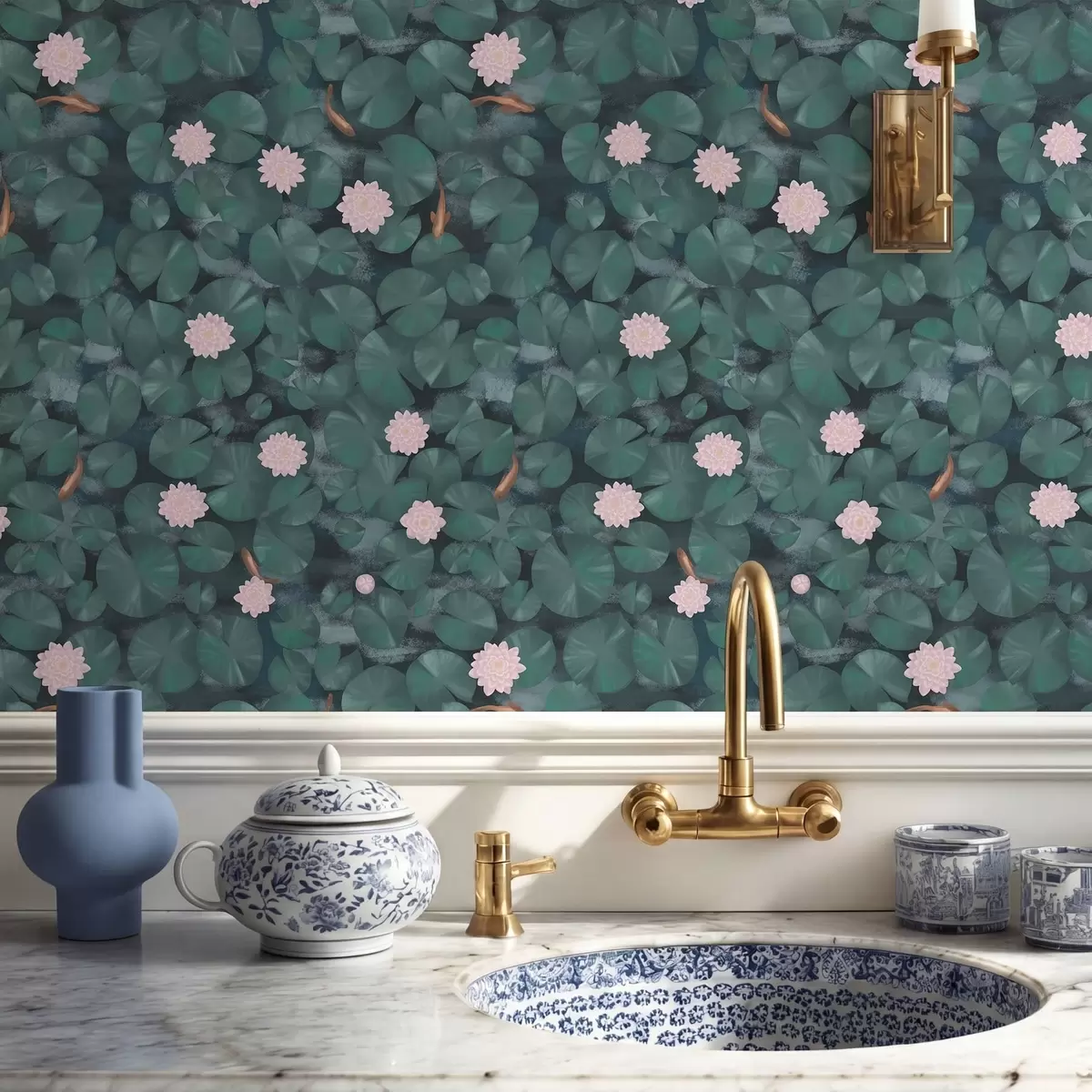 Papel pintado Nenúfares con flores y peces sobre fondo oscuro Nr. a01177